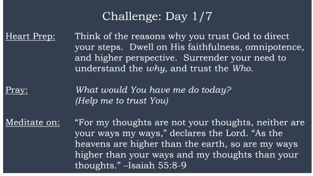 In the video I explain why I want to embark on a 7 day challenge of asking God each day what He would have me do. Each day I will explore that concept from a slightly different angle—hoping to develop practical habits to consider God’s will in all of my decision-making. Come along with me!